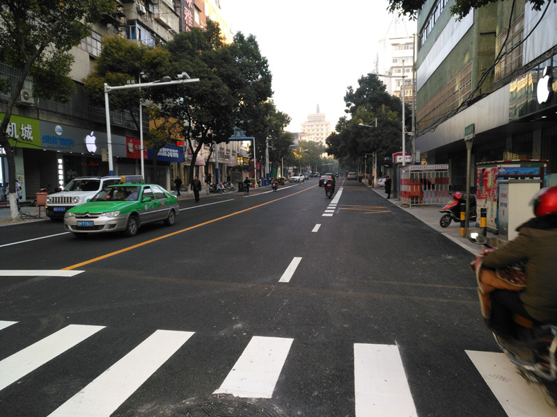 施工内容包括路面及地下管网改造两部分,其中快车道全幅加铺沥青混凝土,进行“黑化”改造,显著提高道路行车舒适性;两侧老旧人行道、路缘石、树池石翻挖新建,提升城市道路形象,秉承“海绵城市”理念,人行道采用透水混凝土结构;改现状雨污合流管道为雨污分流,将现状雨污合流管道改建为雨水管道利用,同时在道路新建一道400㎜的污水管道,提高道路排水能力,畅通地下排水。